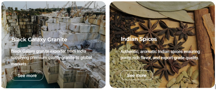Fresh produce, spices, natural powders, processed foods, granite, and biomedical products for global trade.